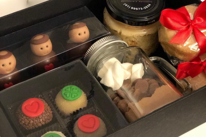 Para comemorar o dia de Santo Antônio, a confeiteira curitibana Roberta Schwanke preparou uma caixa especial, que tem um bolinho de Santo Antônio, chocolate quente, bem casados, bombons com recheios trufados e brigadeiros decorados. E o bolo tem que contar com a sorte: pode ter ou não o santinho dentro. A caixa completa sai a R$ 149 e é preciso encomendar. No domingo (13) os bombons em formato de Santo Antônio e o bolo também poderão ser comprados pelo Ifood.