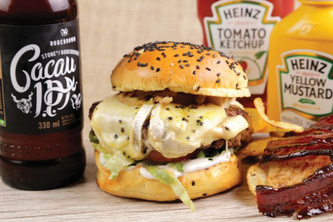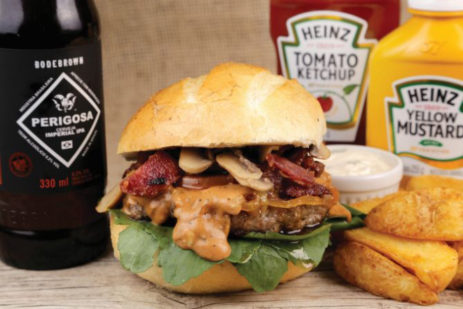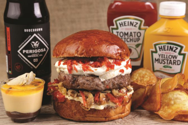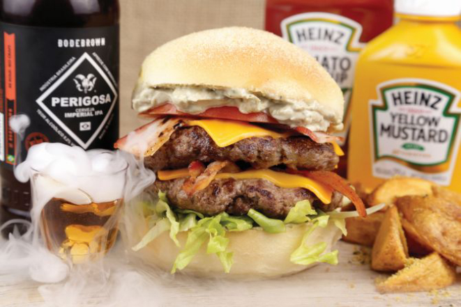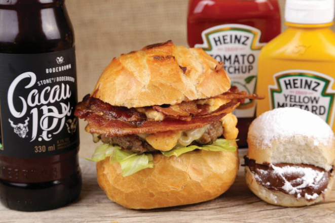 John e Yoko: pão australiano, hambúrguer de costela, gorgonzola, geleia de pimenta chipotle e bacon. Acompanha hambúrguer doce (pão de sonho, brownie, cream cheese e calda de morango).
