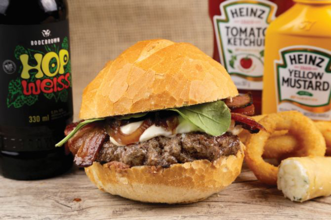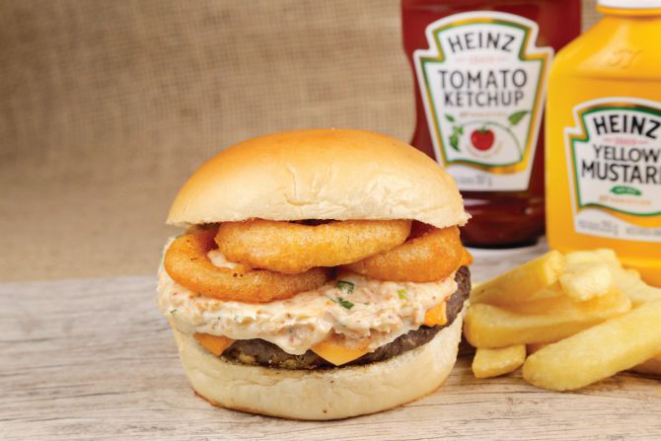 Rock & Ribs Special Burguer: hambúrguer de 200g de carne bovina grelhado, coberto com costelinha desfiada, queijo cheddar e molho barbecue ranch, servido no pão de hambúrguer australiano. Acompanha onion rings.