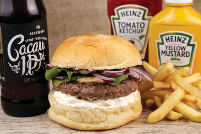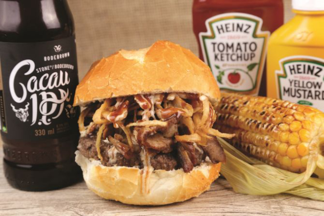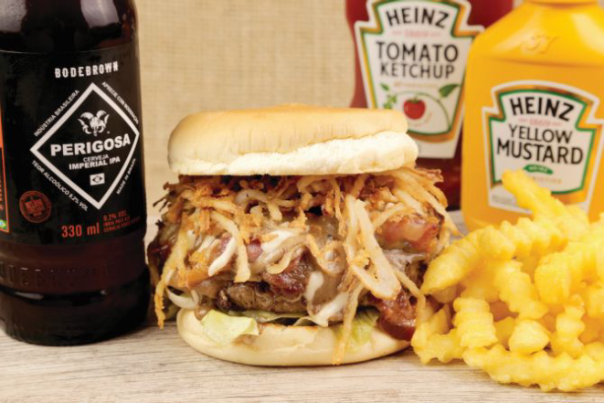 Papa Joe: kobe burger 180g, cheddar cremoso e fatiado, BBQ onions, bacon pipoca, cobertos com cebola crocante e molho BBQ no pão australiano. Acompanha fritas da Fábrica