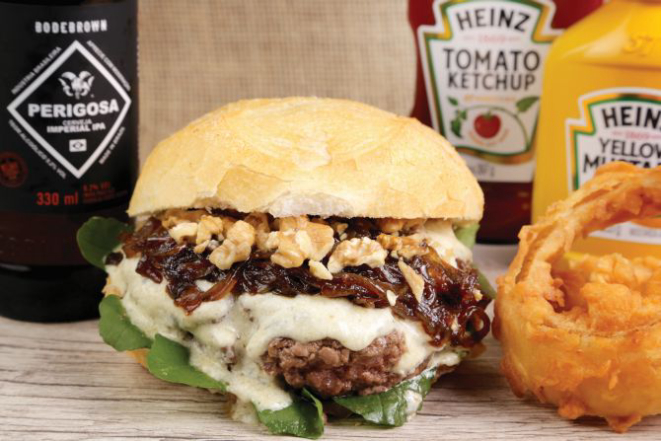 Burgão da Porra: burguer 250g blend da casa, bechamel de gorgonzola, cebolas caramelizadas, nozes quebradas e rúcula no pão estrela. Acompanha conan onion rings e molho barbecue da casa.