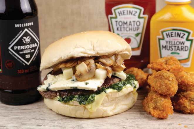 Charles Blue Cheese & Magic Mushroom: hambúrguer de contra filé, queijo gorgonzola, cogumelos paris puxados na manteiga, palmito, pesto de rúcula e molho especial da casa. Acompanha cogumelos paris empanados.