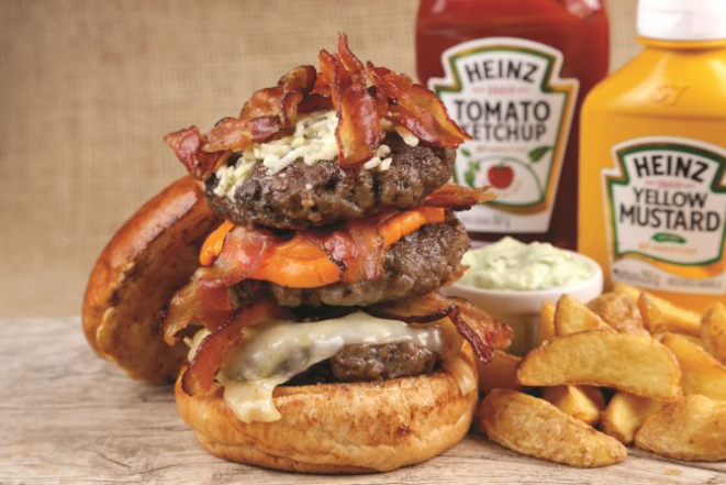 Hat Trick: pão tradicional, 3 hambúrgueres de costela, 3 camadas de queijo (cheddar, muçarela e provolone) e bacon. Acompanha batata rústica com maionese de cebolinha.