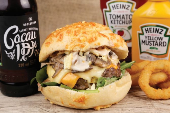 Confraria Premium Burger: pão de parmesão, burger de 200g, maionese de bacon, rúcula, queijo cheddar e muçarela derretidos sobre o burger, cogumelos na manteiga cobertos por crispy de provolone. Acompanha onion rings.