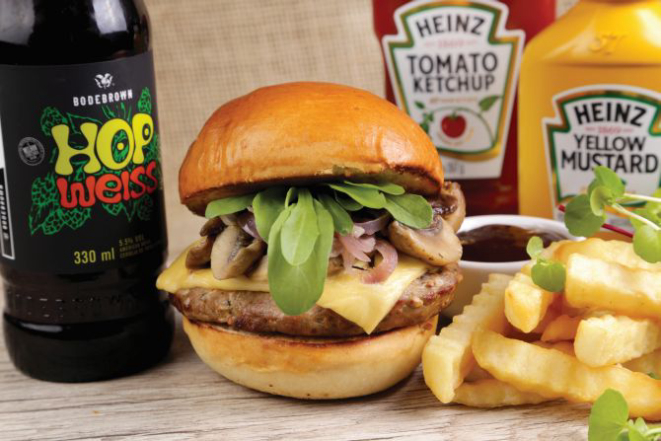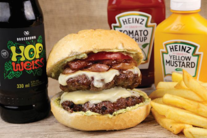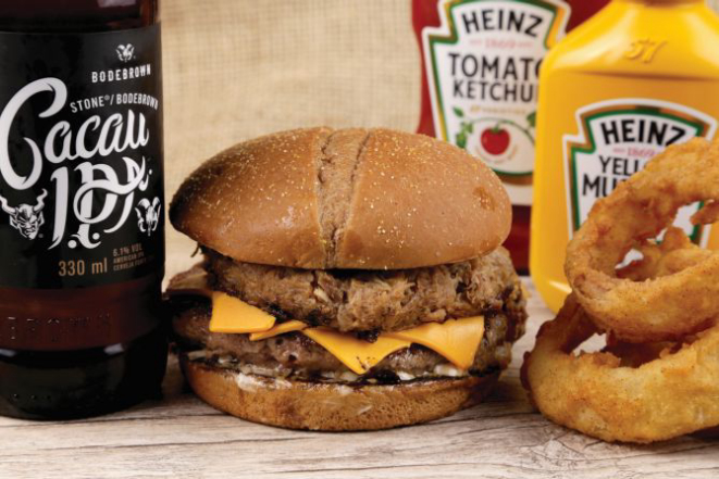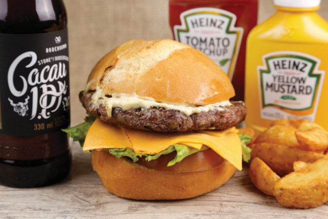 Cervejetariano: dois burgers de grão de bico(150g cada), alface, tomate, mix de queijos derretidos e barbecue da casa servidos no pão estrela. Os veganos podem pedir o sanduíche sem queijo. Acompanha conan onion rings e molho barbecue da casa.