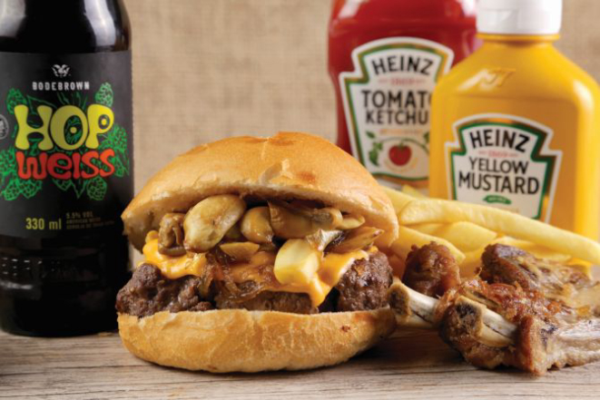 Ultimate: pão francês crocante, 200g de burguer de costelinha de porco, cebola caramelizada, tomate assado, cogumelos, agrião, bacon crocante e molho Jack Daniel’s honey. Acompanha batatas especiais com molho de alho Celeiro.