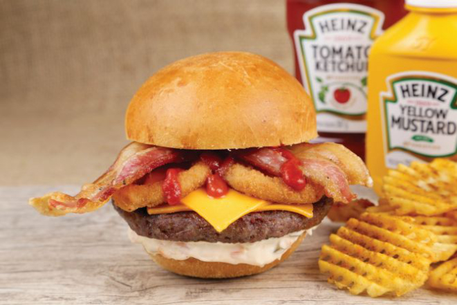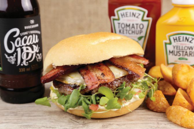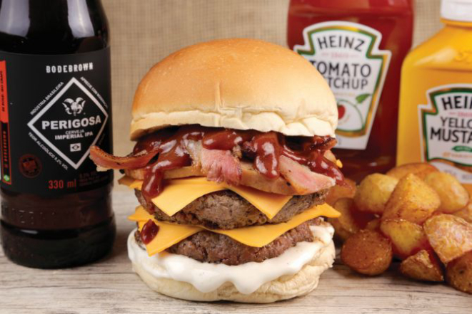 Pedreira: hambúrguer de costela com bacon 250g, creme de cheddar fundido com pepperoni, onion rings, fatias de bacon crocante, molho barbecue e maionese da casa no pão rústico. Acompanha batatas crinkle.