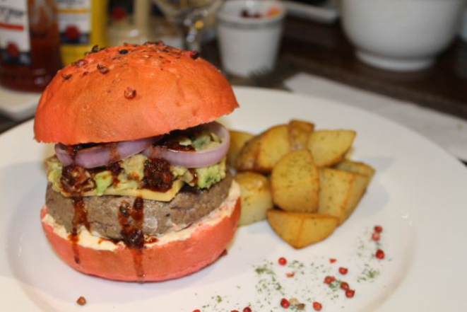 Frida Burguer: dois hambúrgueres de carne bovina (100g cada), maionese de endro e alcaparras, chiffon de alface crespa, queijo muçarela, geleia de bacon com abacaxi e pimenta, tomate chapeado no pão d’água de fabricação própria. Acompanha dadinhos de tapioca com queijo coalho e ervas.
