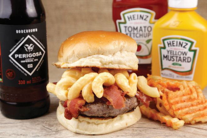 Mac & Cheese Burger: pão cervejinha, hambúrguer 100% angus, bacon e mac & cheese. Acompanha small fries (mix de batatas com tempero da casa, servidas em 3 diferentes formatos).
