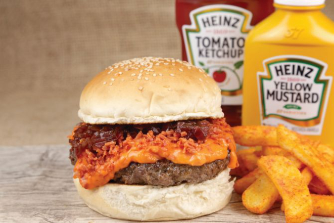 Nebraska Pepperoni: pão de brioche, burger bovino de 180g, queijo cheddar cremoso com pepperoni e cebola no molho inglês. Acompanha batata em corte especial com páprica picante.