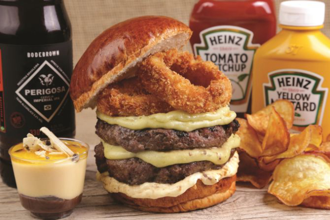 Tapa Olho: pão de brioche, maionese de bacon, 2 hambúrgueres de 120g, onion rings e creme de gorgonzola. Acompanha chips de batata doce e minimousse de maracujá com raspas de chocolate branco.
