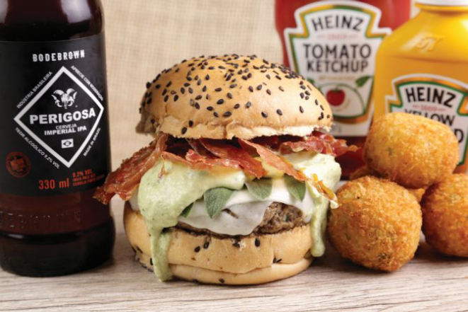 Red Rock Lamb: pão defumado, hámburguer de 150g de cordeiro, queijo de búfala, creme de palmito com especiarias, sálvia, crispy de copa e maionese da casa. Acompanha croquete de muçarela de búfala.