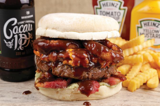 Pedreira: hambúrguer de costela com bacon 250g, creme de cheddar fundido com pepperoni, onion rings, fatias de bacon crocante, molho barbecue e maionese da casa no pão rústico. Acompanha batatas crinkle.