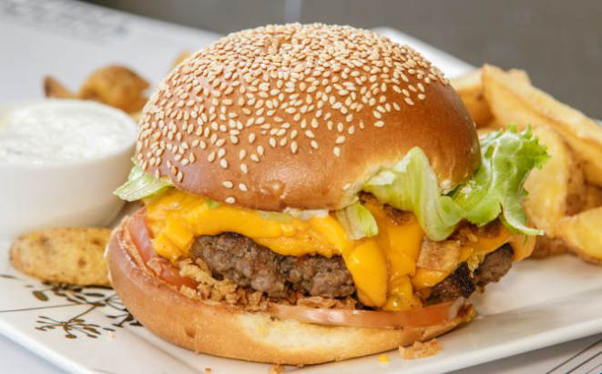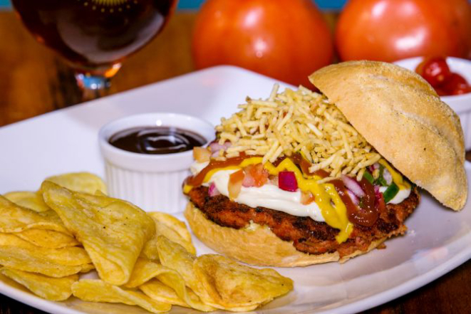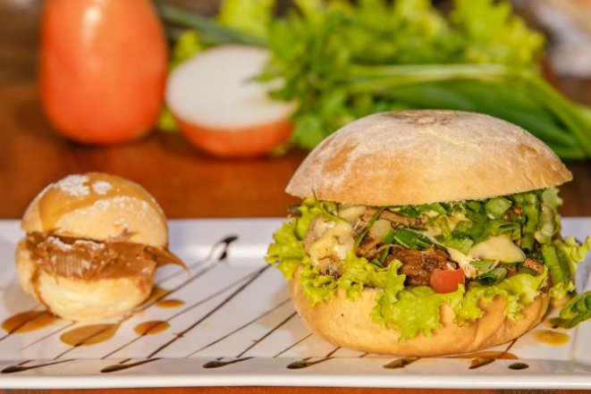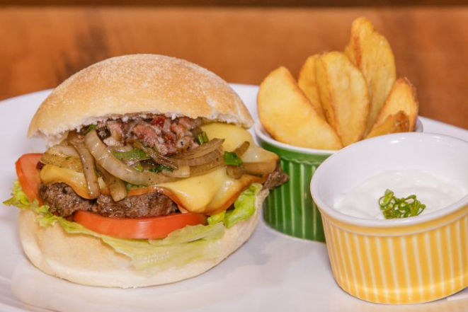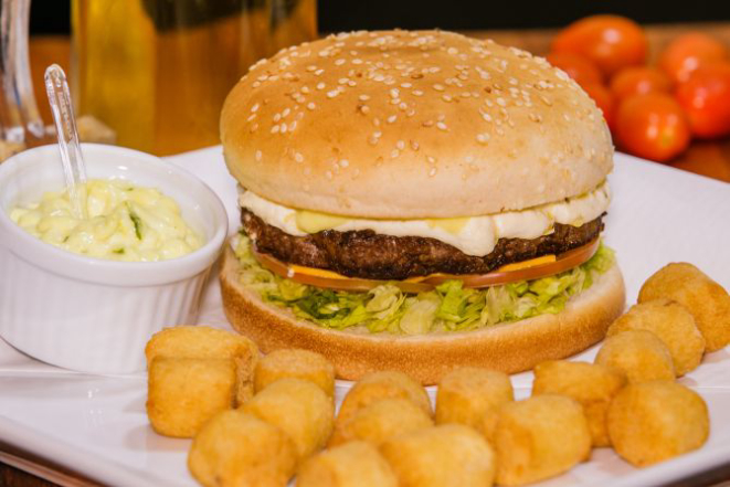 Hambúrguer de costela bovina 200 g, queijo cheddar fatiado, cream cheese, alface e tomate e molho chimichurri. Acompanha tapiocas em cubos.