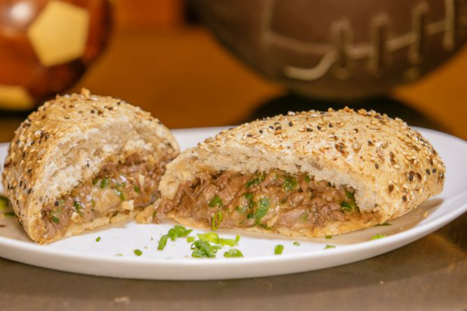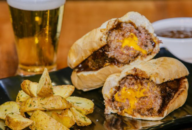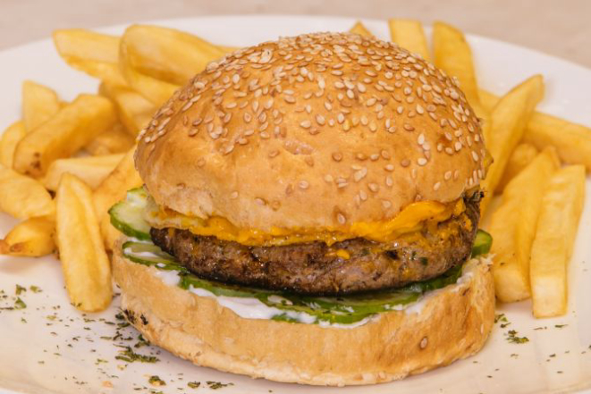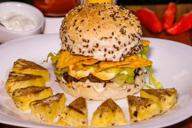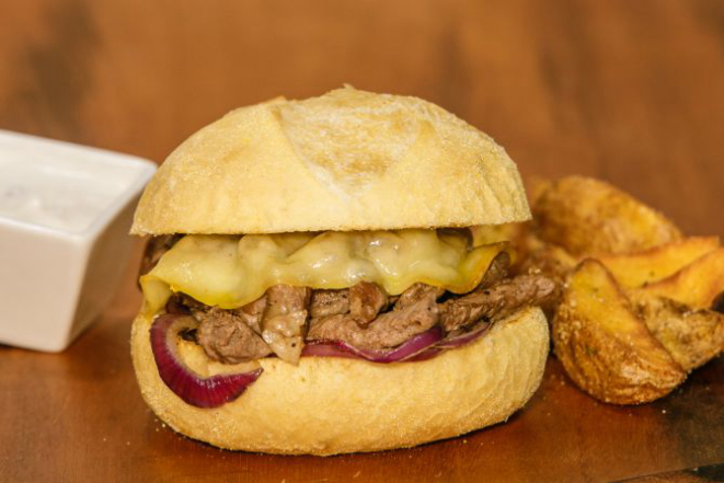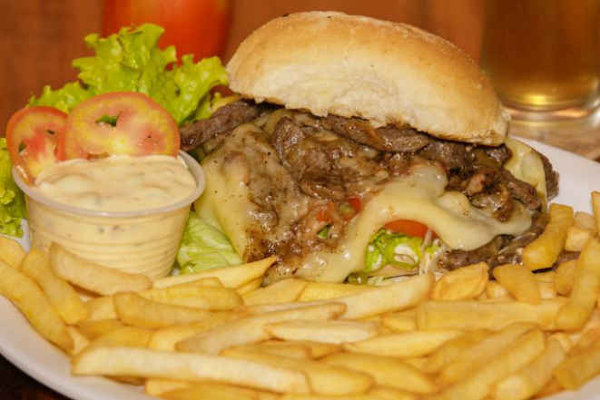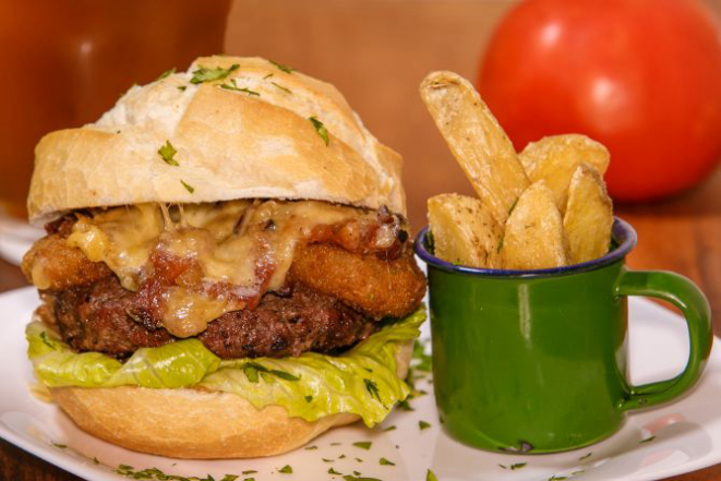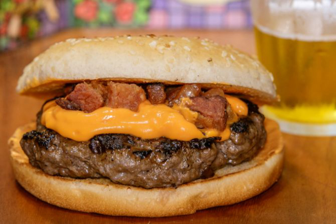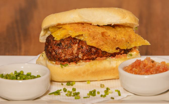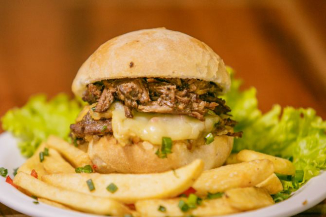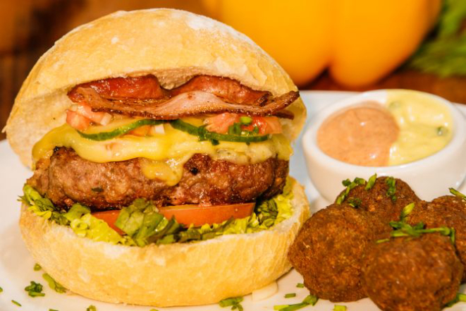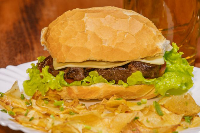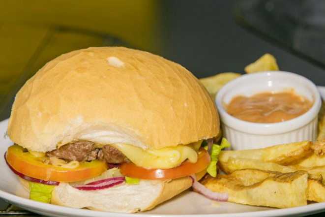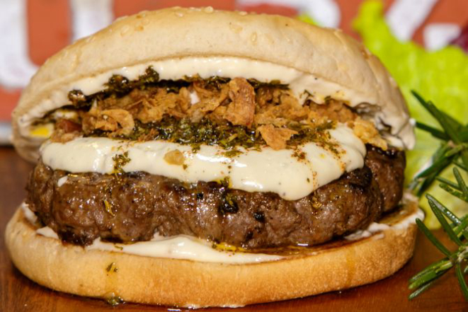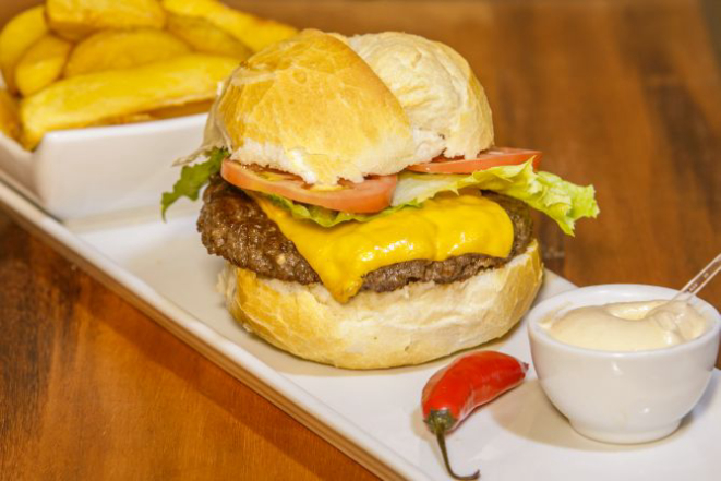 Hambúrguer de costela bovina 200 g, queijo cheddar fatiado, cream cheese, alface e tomate e molho chimichurri. Acompanha tapiocas em cubos.