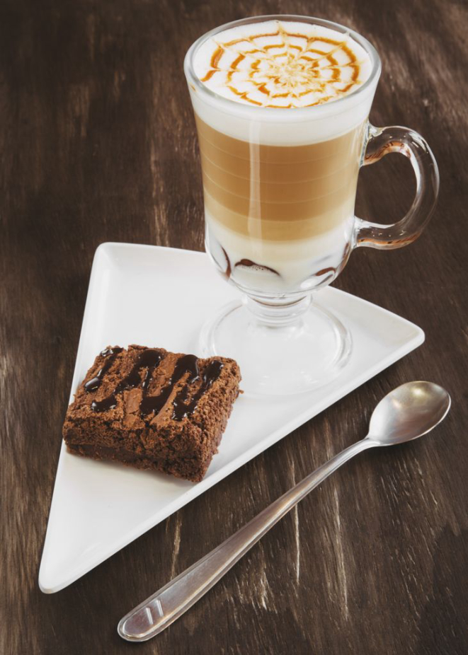 Café Latte M 240ml + 1 Financier de pistache com frutas vermelhas, chocolate com framboesa ou caramelo com chocolate (R$ 9,90); e Cappuccino Degusto M 240ml + Brownie especial da casa (R$ 14,90).