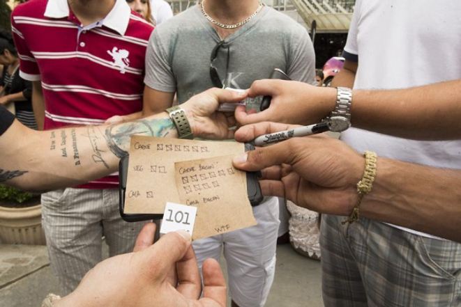 Os amigos Nicole Ferreira, Angelo Gabardo e Peterson Domingues chegaram no local às 15h para garantir o primeiro lugar na fila. “A Nicole avisou a gente pelo Facebook e já combinamos de vir, está tudo muito organizado e a ideia da promoção é muito boa”, afirmou Angelo. Para Nicole, o Whatafuck tem o melhor hambúrguer de Curitiba e naquele momento também o mais barato. Eles receberam as três primeiras senhas pontualmente 16h30, e 495 números foram entregues até 18h15. Os últimos cinco números foram reservados para convidados.