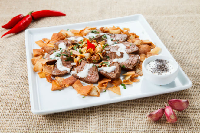 Fate Salim: carne fatiada temperada, grão-de-bico, amêndoas fritas, pão árabe torrado e molho de tahine. Preço: R$ 24.