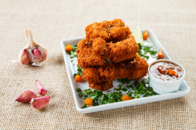 Tilápia Crocante: iscas de tilápia empanadas na farinha de arroz. Acompanha maionese da casa.