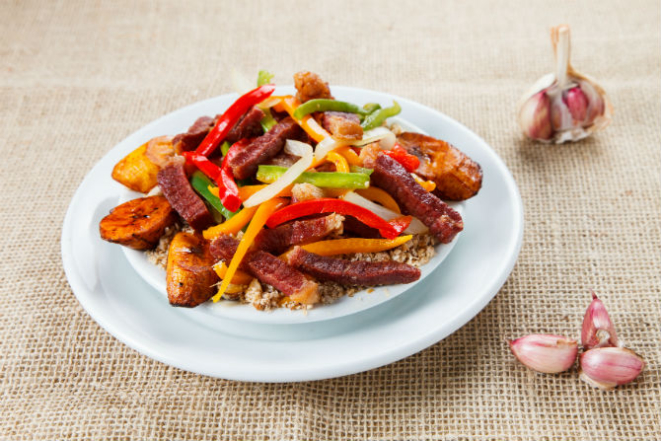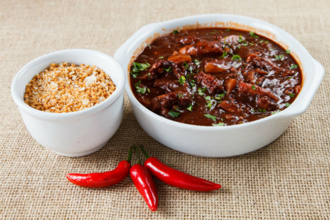 Virgulino: carne seca em tiras, pré-cozida em tempero da casa com ervas. Fritura leve com cebola, pimentões e molho picante. Finalizado em manteiga de garrafa e servido com base de farofa com aveia em flocos, banana da terra e castanha do pará.