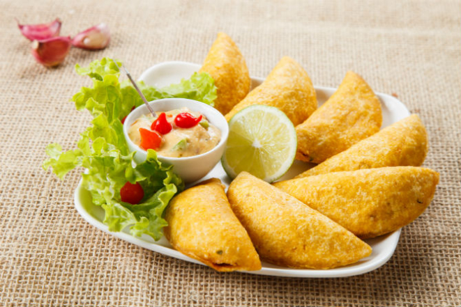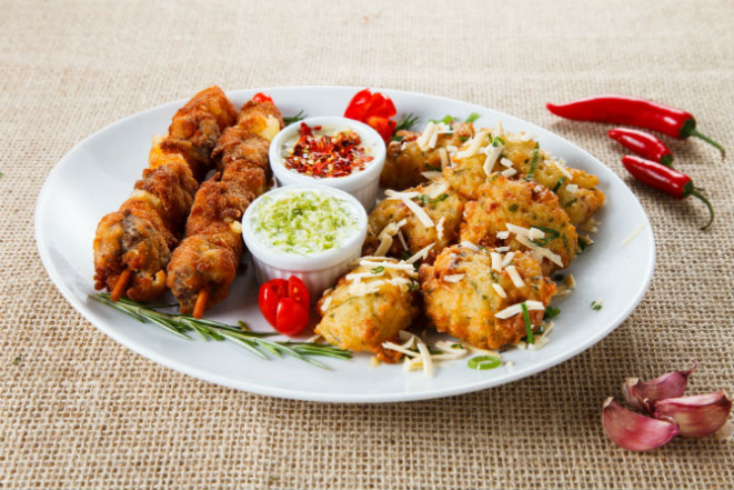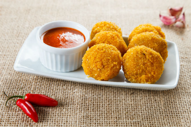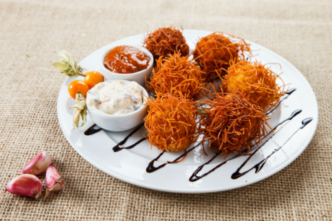 Cabelo de Anjo: bolinhos fritos à base de milho verde, recheados de queijos nobres e especiarias, empanados no macarrão cabelo de anjo.