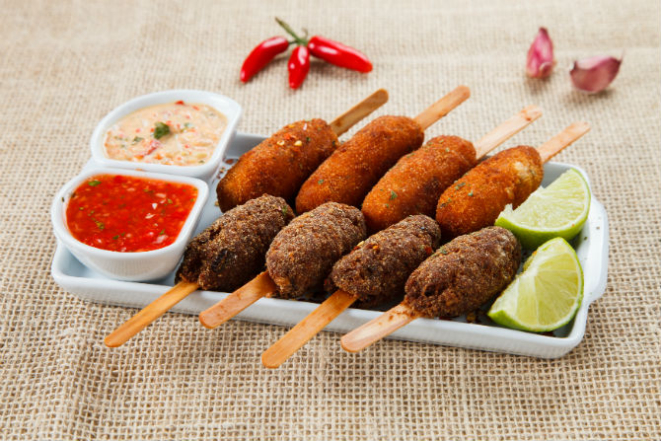 Brega e Chique: bolinho de arroz com queijo parmesão e calabresa (o brega) e espeto de mignon à milanesa com queijo provolone (o chique). Acompanha molho azedo e molho especial da Zize.