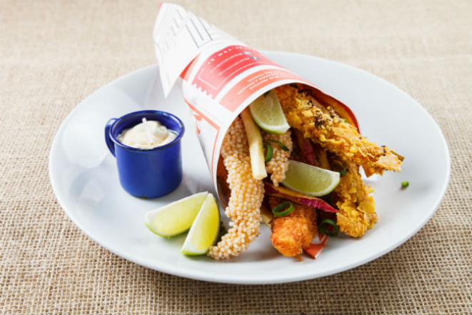 Serial Fisher: peixe frito empanado com três farinhas diferentes: Panco, farinha de milho e flocos de arroz, Acompanhado de batata doce frita. Preço: R$ 25,90.