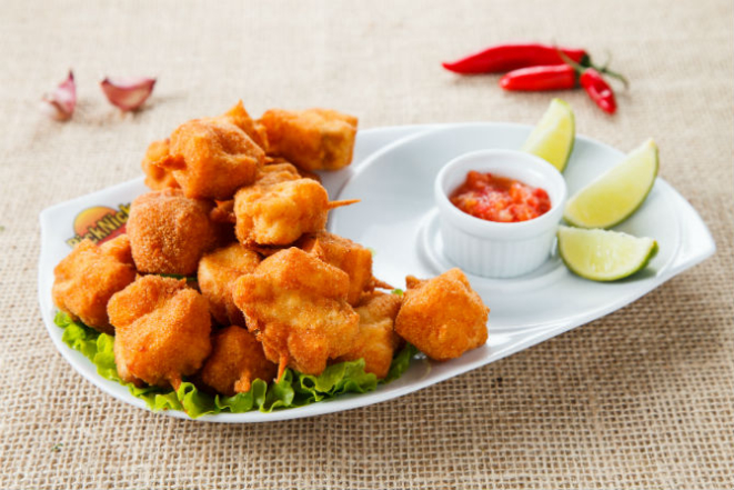 Agarradinho de Tilápia: Espetinho de tilápia com queijo coalho empanados.