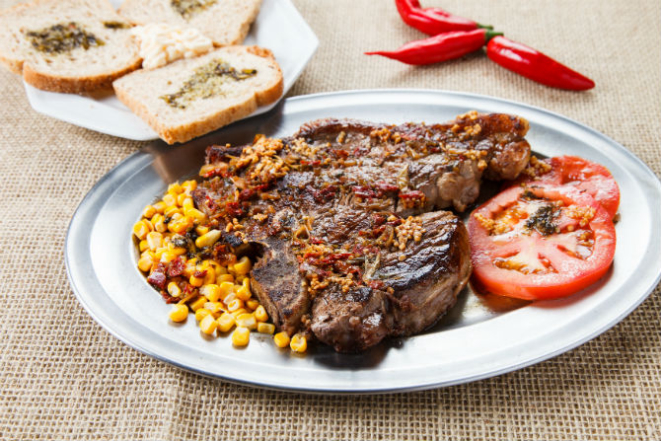 T-Bone do Tatu: Filezinho t-bone com milho verde e pão.