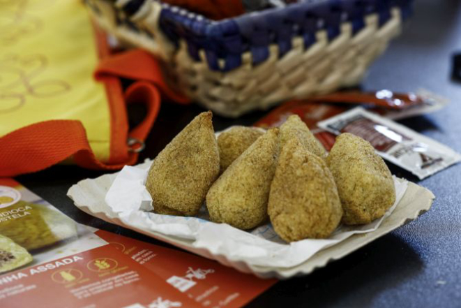 Coxinhas assadas sem glúten e sem lactose estão disponíveis no estande do Casal Coxinha. Elas são feitas com massa de mandioca e temperos naturais e empanadas com farinha de rosca sem glúten. Tem recheio de costela, alho-poró, carne seca, carne moída e frango com mandioquinha. O pacote com 500g de coxinha congelada custa R$ 18.