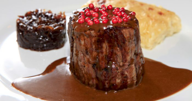 O couvert terá manteiga, roquefort, tapenade de azeitonas, geleia de tomate e pães com o espumante português Brut Messias Millésime 2013, da Bairrada. Para a entrada, vol au vent de mix de cogumelos gratinado com brie e Côtes du Rhône, de Abel Pinchard. O prato principal é mignon ao molho poivre, confit de cebola e gratin de batatas com Château Labat, de Nony Borie, de Bordeaux.