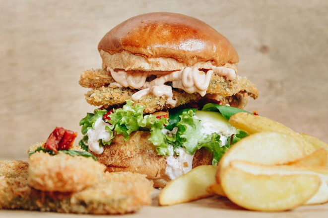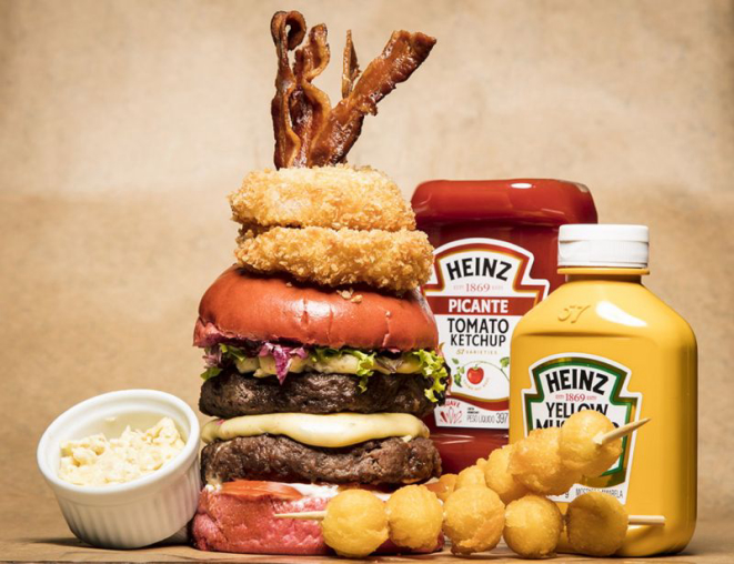 Hambúrguer 160g Carne Angus, pão brioche macio com picles empanado e frito, alface, maionese de bacon, bacon laminado, queijo muçarela, tomate seco, molho rosé e rúcula). Foto: Divulgação.