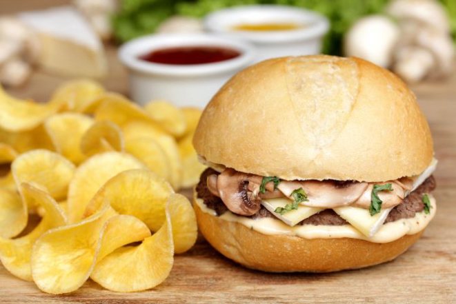 Opção 1- Charlie Hebdo (pão francês, hambúrguer de bife ancho de 150 g, cogumelos paris frescos passados na manteiga, queijo brie e molho french especial). Acompanha mandioca chips.
