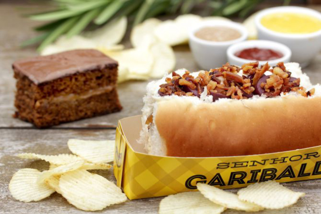 Opção 1- Fábrica Oswaldo Aranha (hambúrguer de Angus de 200 g, queijo coalho, farofa de bacon, cebola crocante e ovos em migalhas, maionese de alcaparra e ervas, cobertos com batatas chips). Acompanham tapioca balls & molho good stuff.