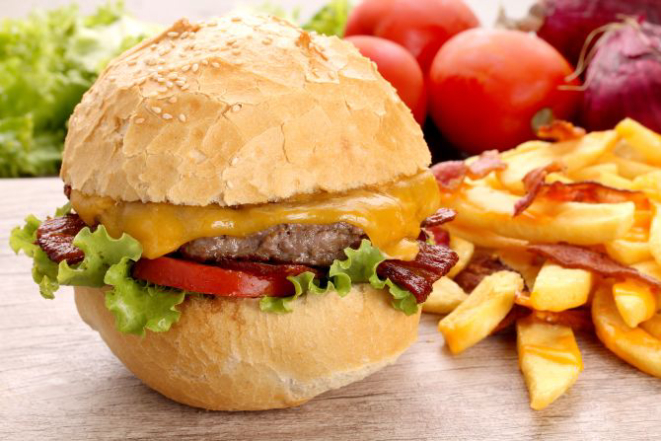 Hambúrguer de carne bovina de 200g recheado com cheddar, cheddar cremoso, cheddar fatiado e molho barbecue. Acompanhamento: Batata corte especial.