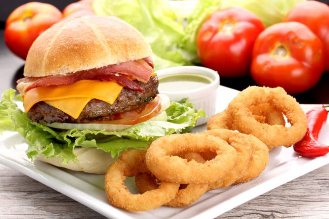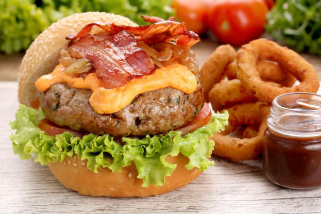 Burger Artesanal de 230g grelhado, bacon, alface americana, tomate, cebola roxa e maionese chacabuco. Acompanhamento: Onion rings.