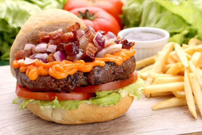 Pão d’água, hambúrguer artesanal de picanha, queijo cheddar, cebola roxa, alface americana, tiras de bacon caramelizado com Jack Honey e molho barbecue. Acompanhamento: Batata rústica e tiras de bacon caramelizadas com conhaque Domecq.