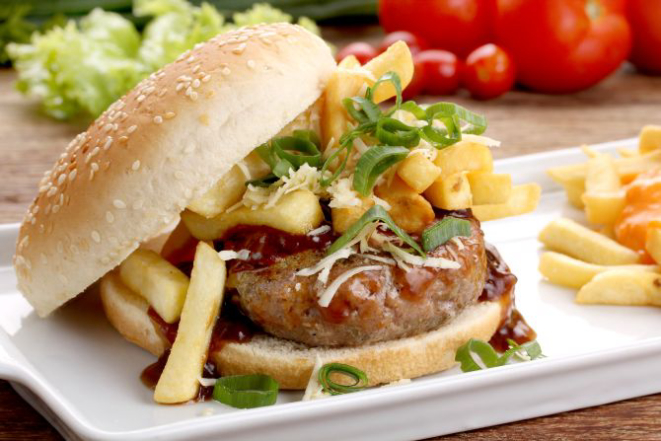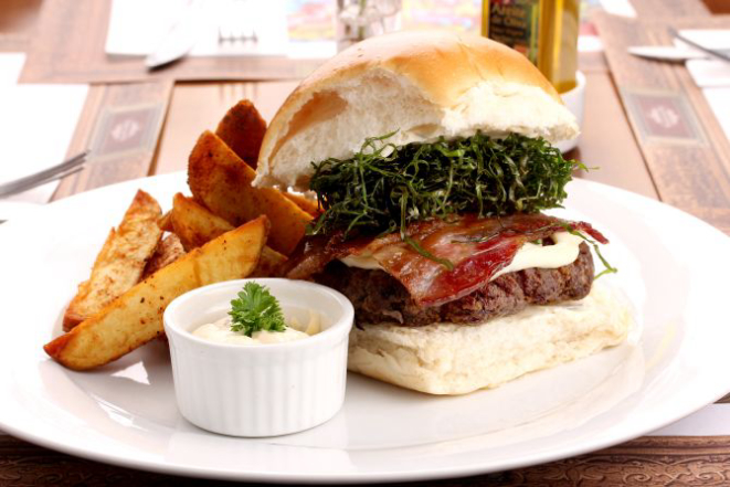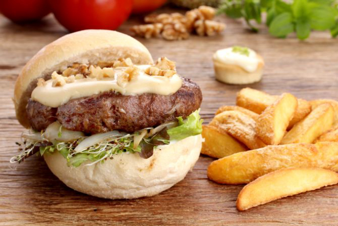 Hambúrguer de carne moída, trigo para quibe, especiarias, hortelã, molho de iogurte, queijo, salada de tomate e cebola e pesto de hortelã. Acompanhamento: Batatas rústicas.
