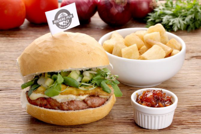 Pão de cerveja, hambúrguer de carne copa suína, barbecue, queijo cheddar, pepino e crocante de nachos. Acompanhamento: Batata rústica crocante na pimenta da Jamaica.