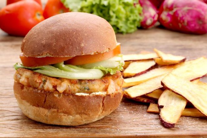 Hambúrguer de camarão de 120g com london sauce (molho rosé), tomate e alface americana. Acompanhamento: Batata doce rústica.