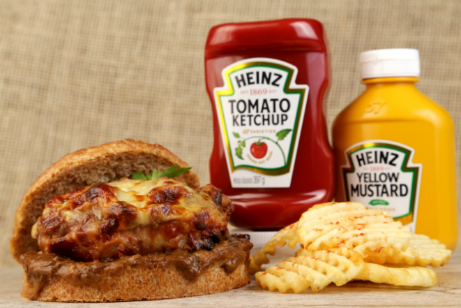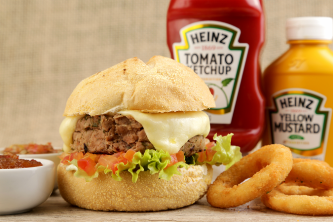 Hambúrguer de frango, queijo cheddar, cebola teriyaki, maionese do cheff, tomate, alface americana e pão vegano. Acompanha cebolas Fren’s.