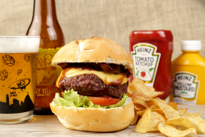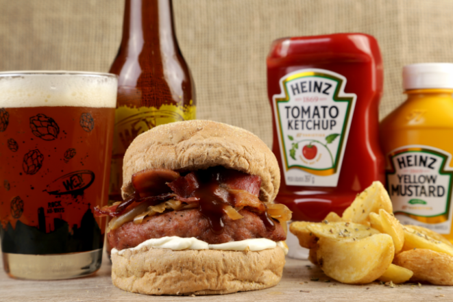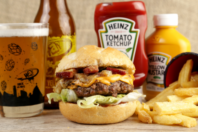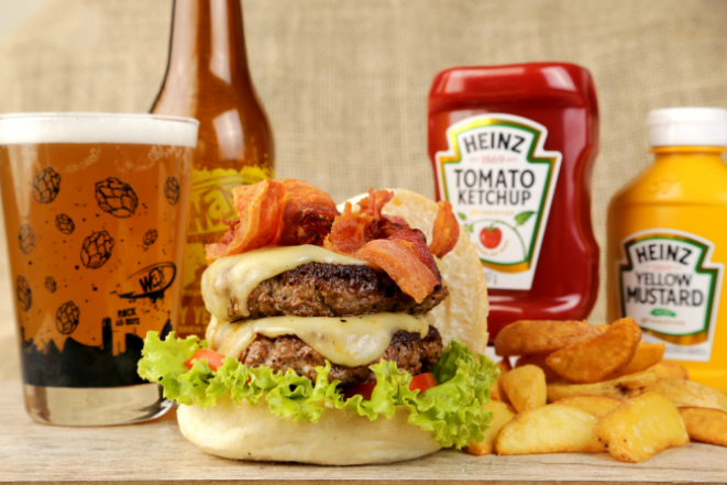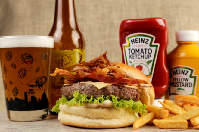Hambúrguer de costela bovina (150g) temperada, com 20% de gordura, coberta por queijo muçarela, cheddar, bacon e cebola caramelizada com cerveja imperial stout servido no pão francês redondo chapeado na hora. Acompanha batatas fritas alioli.