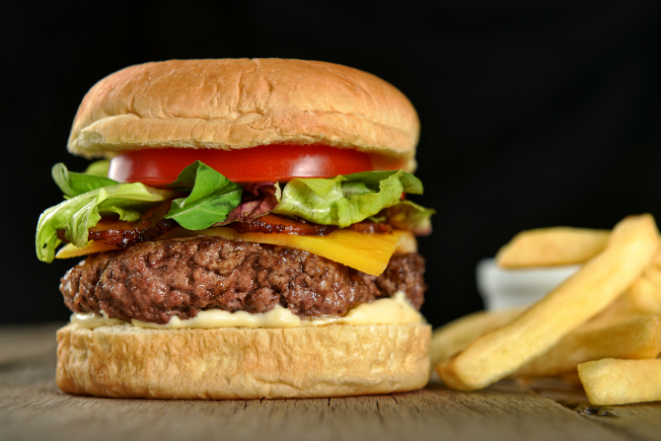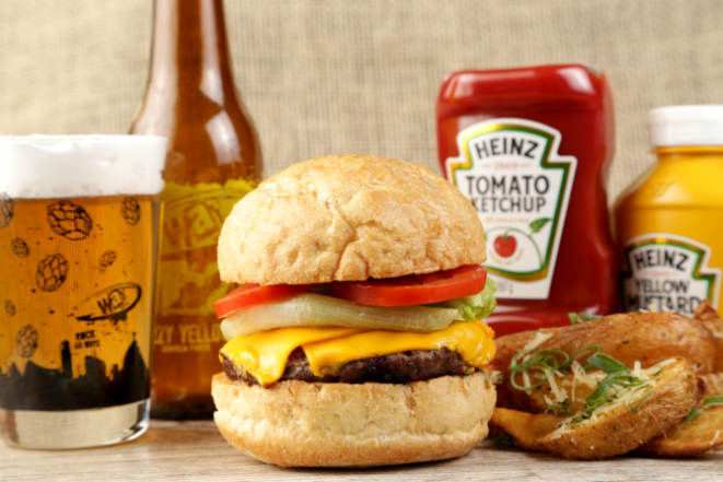 Pão brioche artesanal, queijo cheddar inglês, hambúrguer (160g), alface orgânica, bacon, tomate e molho Caesar. Acompanha batatas fritas.