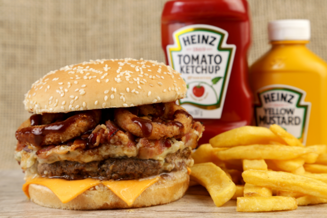 Pão australiano, dois hambúrgueres (120g cada), cebola roxa chapeada, bacon em lascas, cheddas, provolone, duas unidades de onion rings e molho República. Acompanha batatas fritas e molho barbecue.