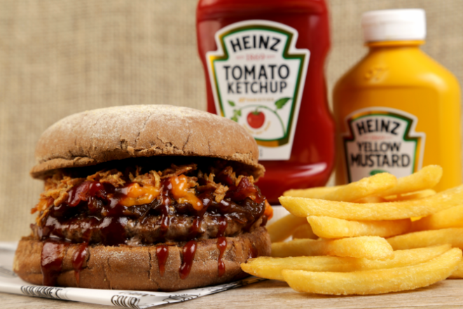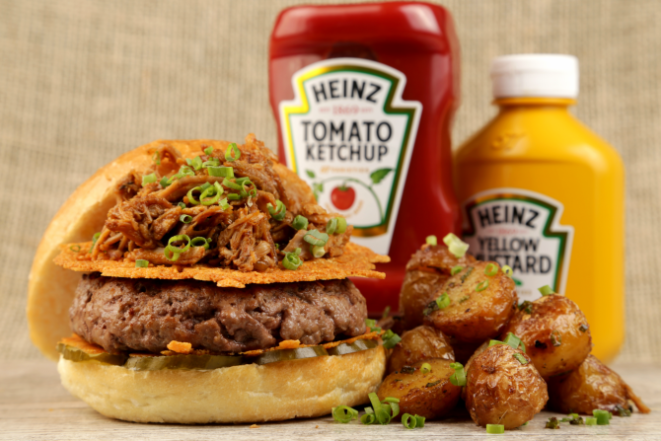 Hambúrguer de carne suína, cebolas caramelizadas e molho barbecue, servido no pão big francês. Acompanha batatas fritas rústicas e uma pequena porção de costela suína assada coberta no molho barbecue.