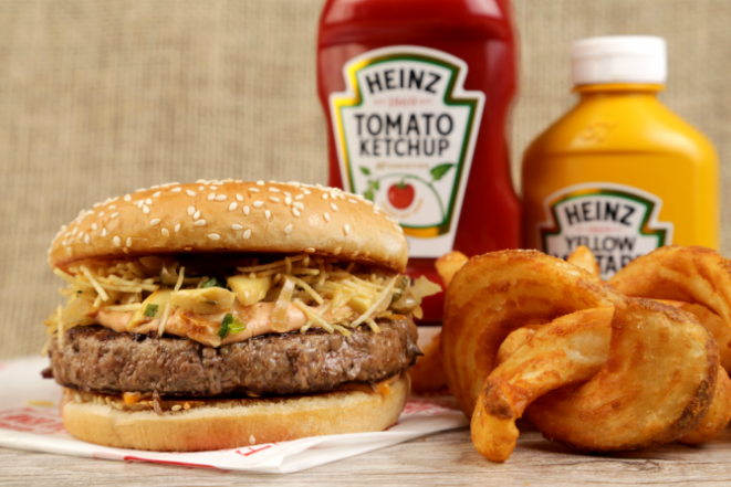 Dois hambúrgueres de fraldinha (120g cada), presunto cru, catupiry, rúcula e maionese da casa. Acompanha chips de batata doce, vinagrete de biquinho e manga.