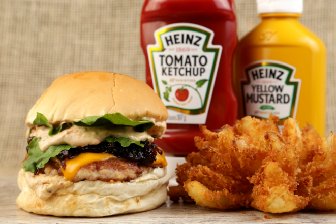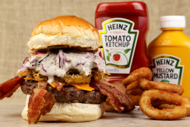 Hambúrguer de black angus, BBQ onions, bacon tostado, cheddar inglês, molho BBQ e cebola crocante servidos no pão australiano. Acompanha batatas fritas e molho parmesão.