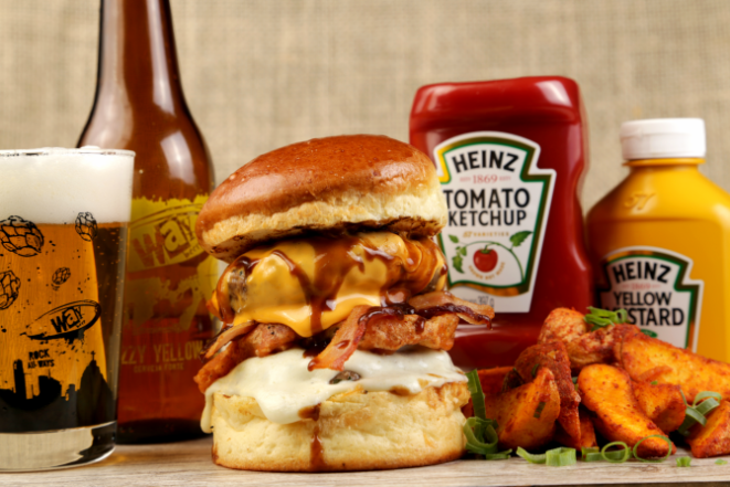 Hambúrguer recheado com purê de mandioca, catupiry, coberto com queijo cremoso e envolto por bacon. É defumado, grelhado na brasa e servido com broa úmida e molho de cerveja stout. Acompanha batata waffle com páprica doce.