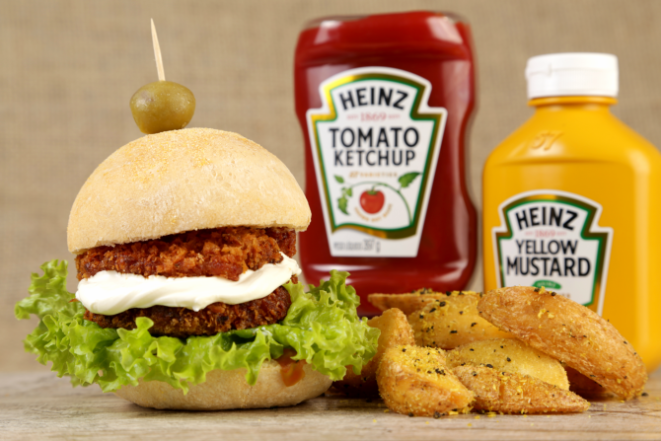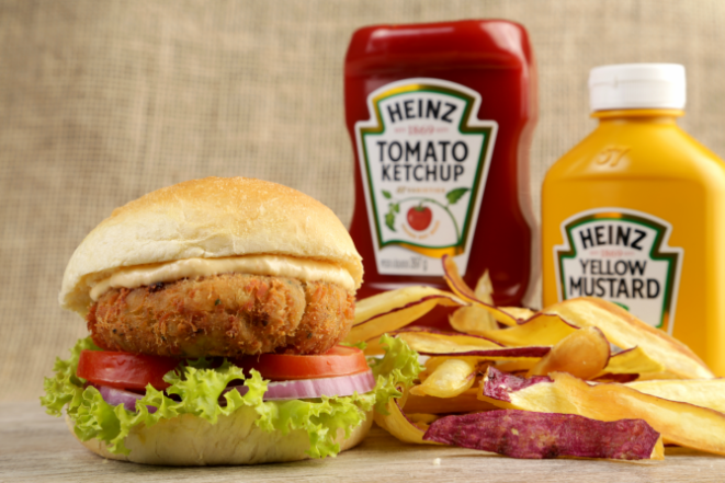 Hambúrguer de mix de legumes, grão de bico, ervas e especiarias coberto com queijo muçarela, pesto mayo, mix de batatas e cebolas em palha e salada Fábrica (alface, tomate, cebola roxa) no pão integral. Acompanha batatas fritas e molho parmesão.