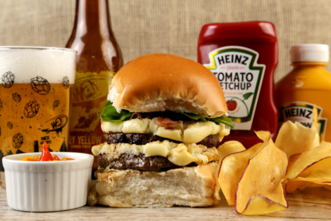 Dois hambúrgueres (160g cada) grelhados no fogo com queijo cheddar derretido, relish de pepino, alface, cebola roxa, molho americano e bacon caramelizado no pão francês ou brioche. Acompanha polenta com queijo, batatas rústicas ou mandioca.